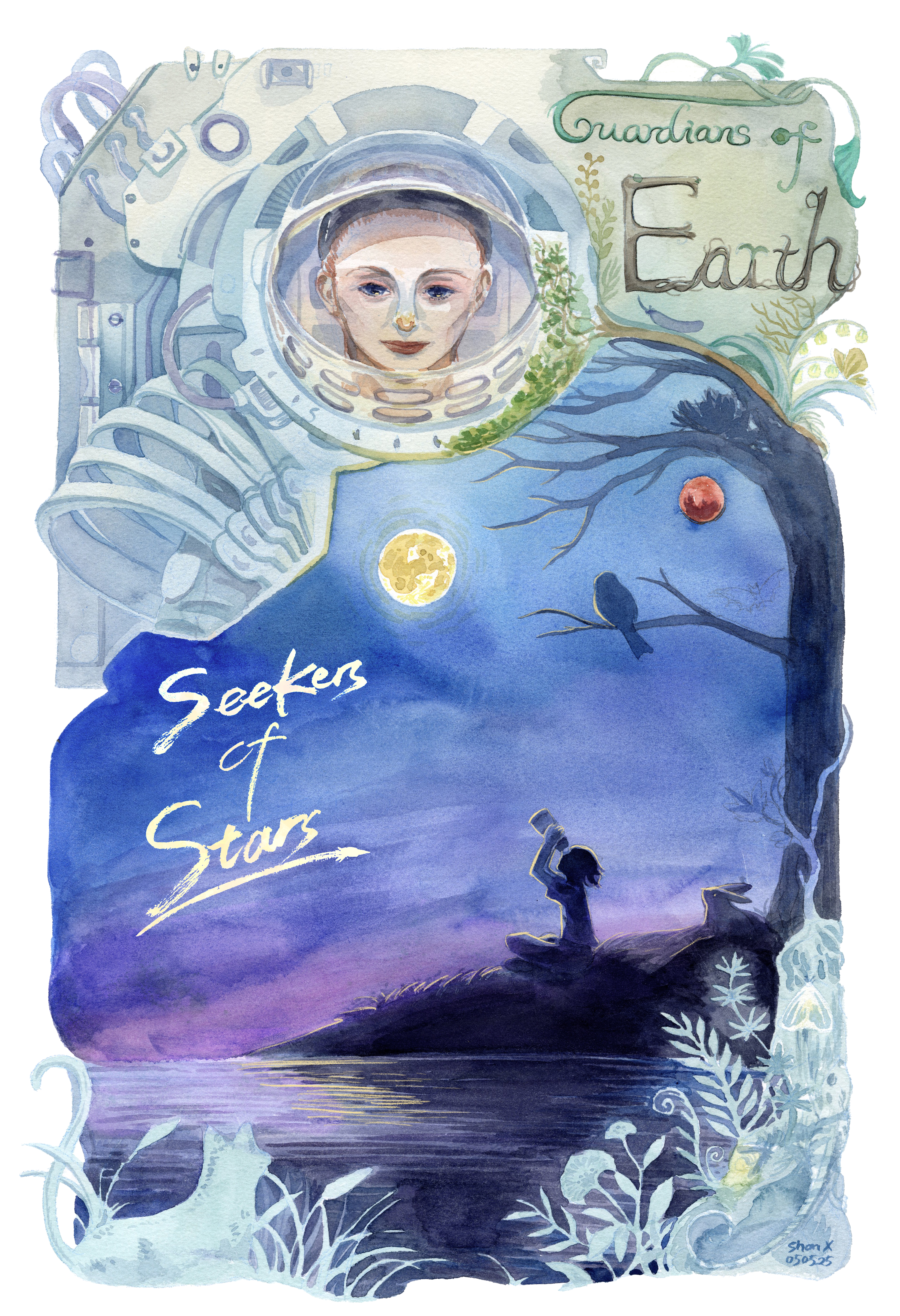 Guardians of earth, seekers of stars, poster design for NASA Artemis II Poster Contest, watercolor, 2025