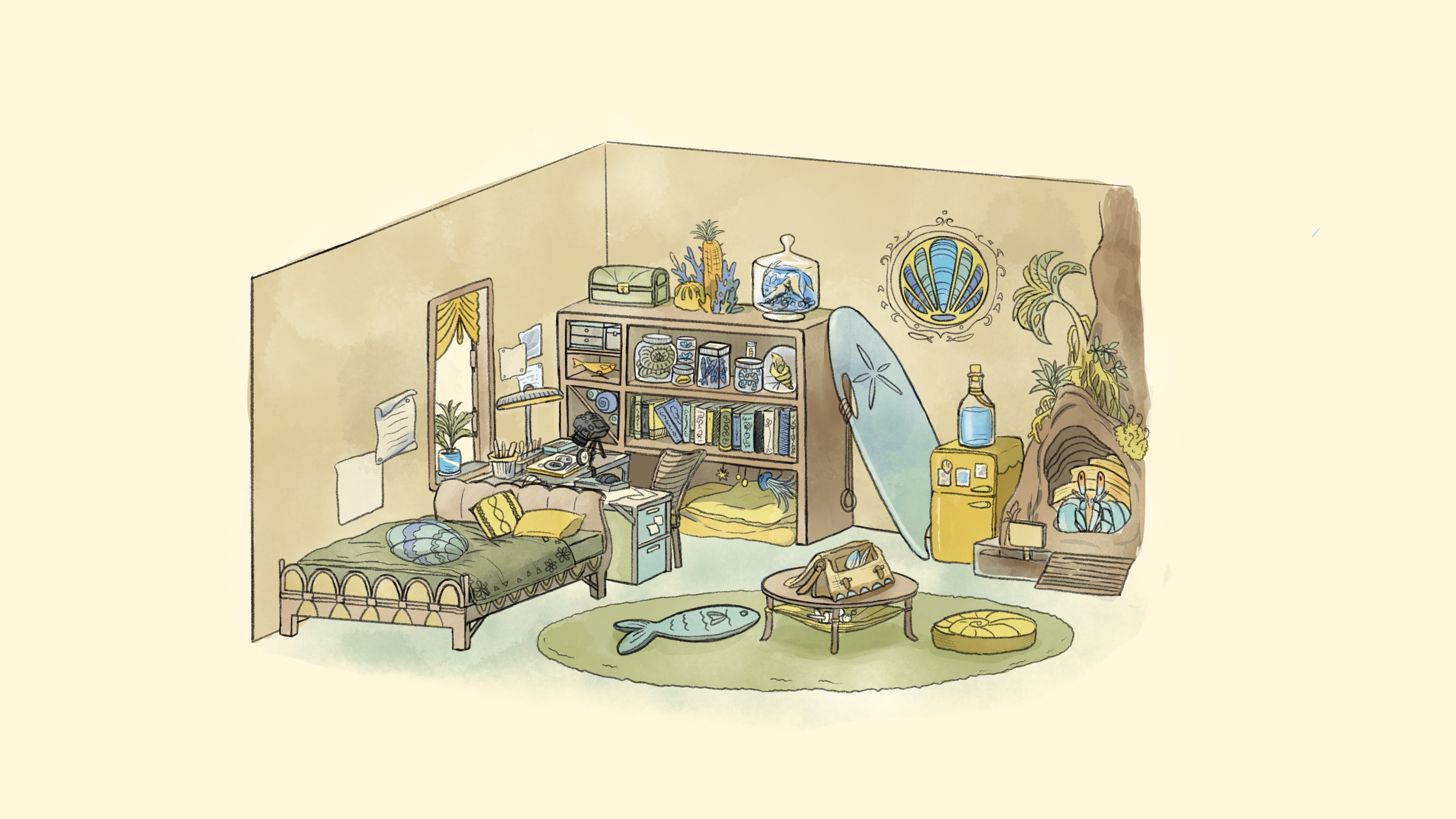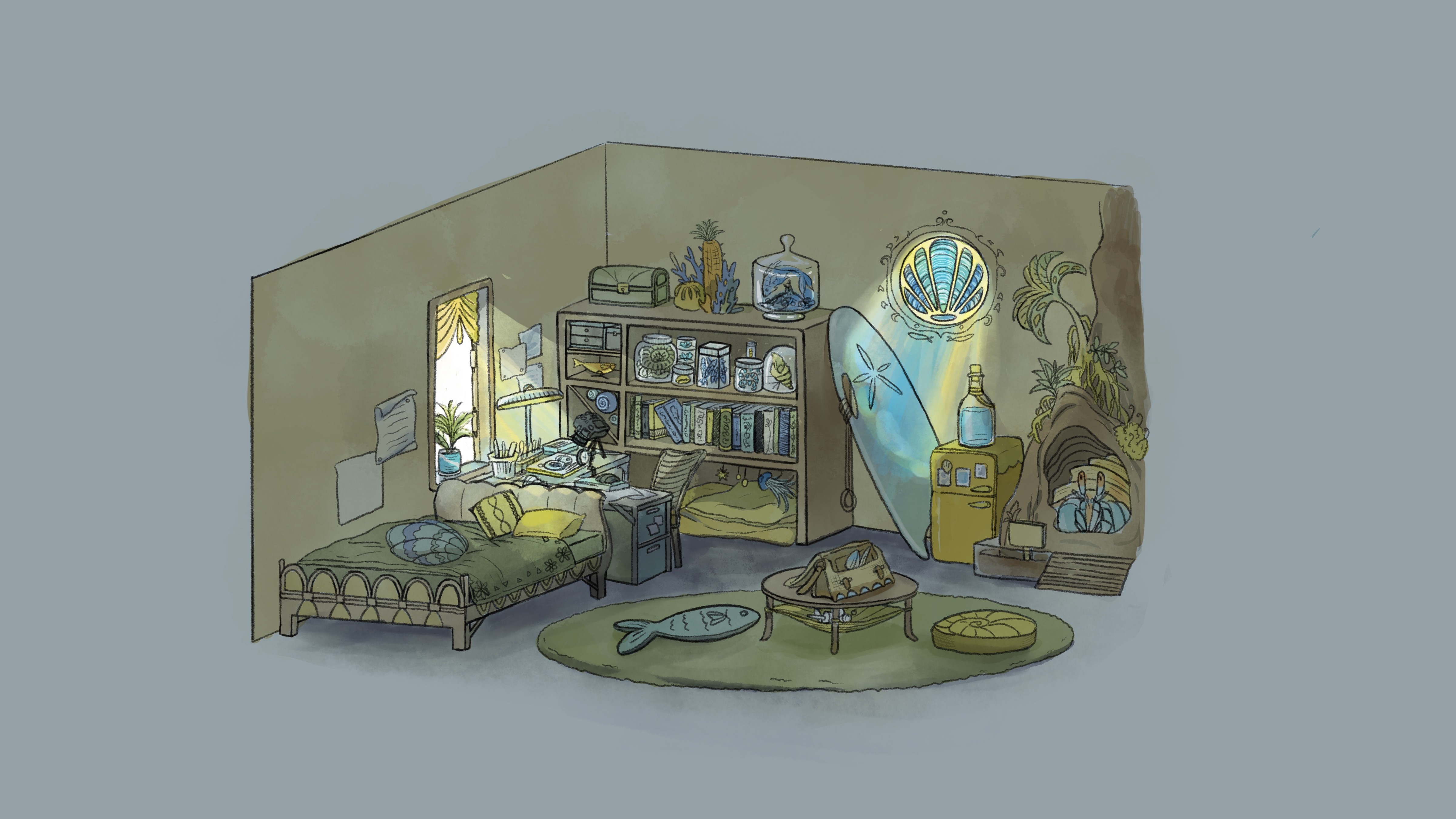 Day/night versions of an original character’s beach house, digital, 2025