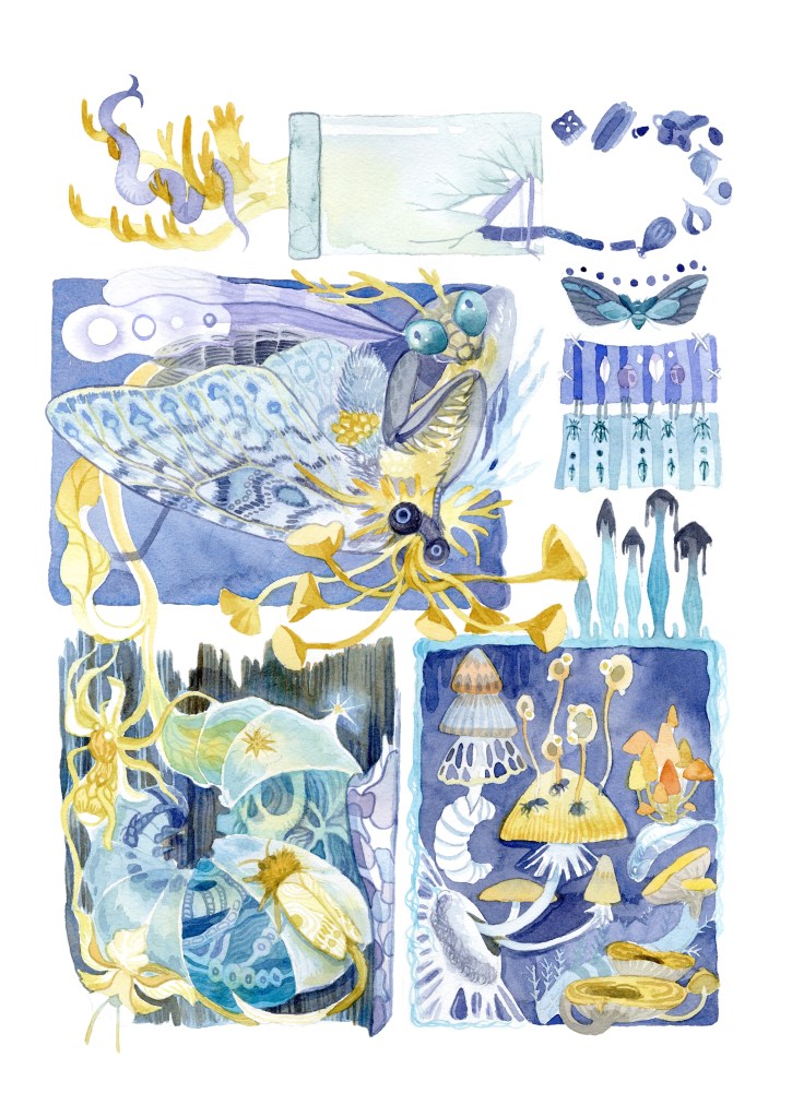 Housed Mushrooms, from my senior thesis “Shan’s Cabinet of Wonder”, watercolor, 2024-2025